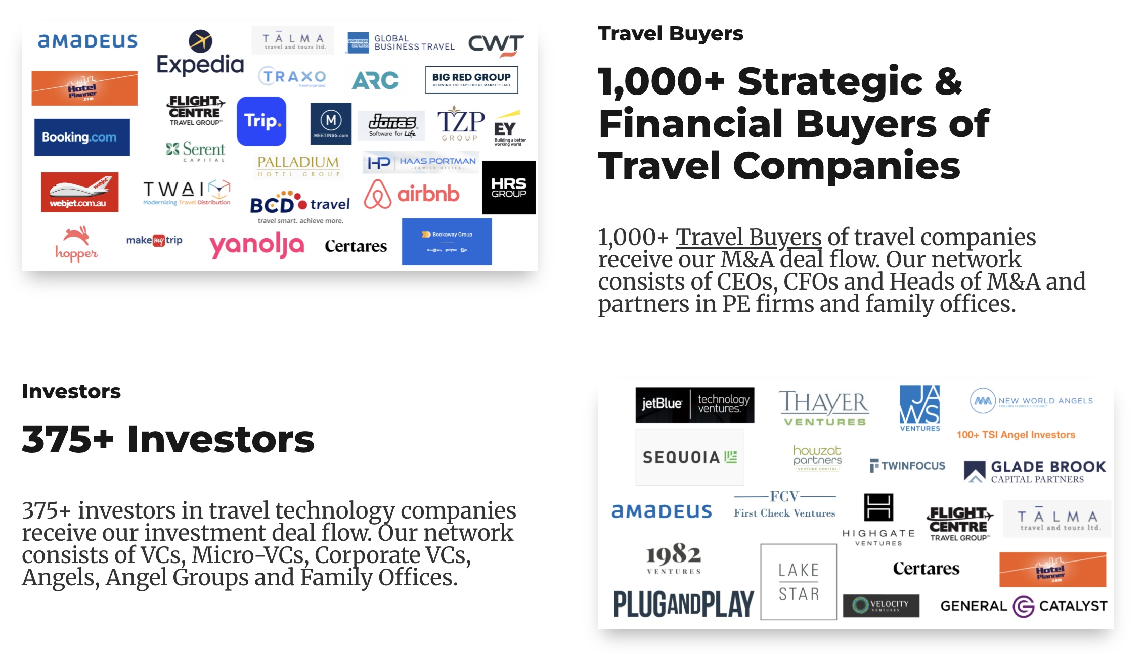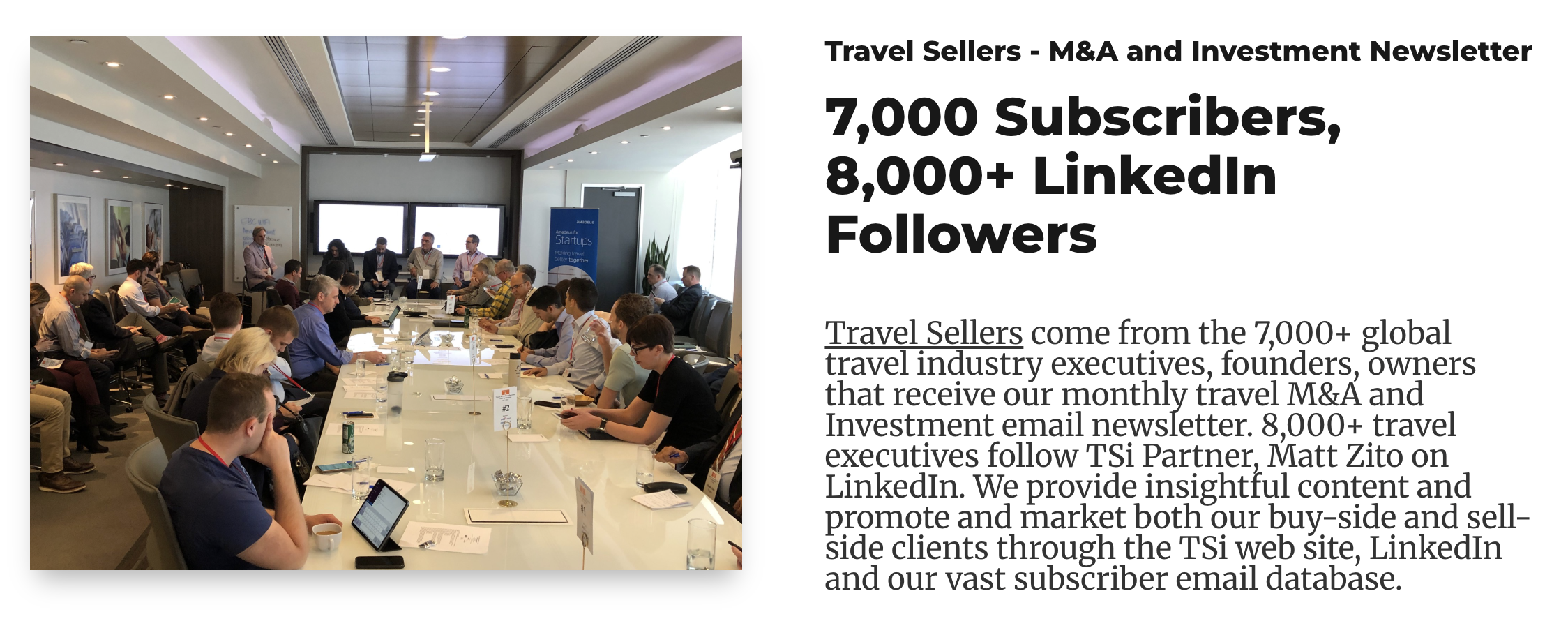 For Deal Makers, C-Level, CEOs/Founders, Investors, Investment Firms, Heads of M&A, Corporate Dev Teams, Family Offices, Search Funds. Receive our Travel M&A and Investment Newsletter. Sent out 1x-2x a month. Includes our deal flow, insights into the current M&A market and recent deals, offers, asks and valuations.